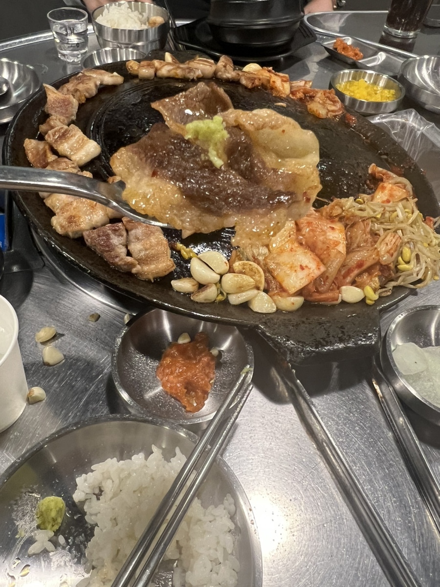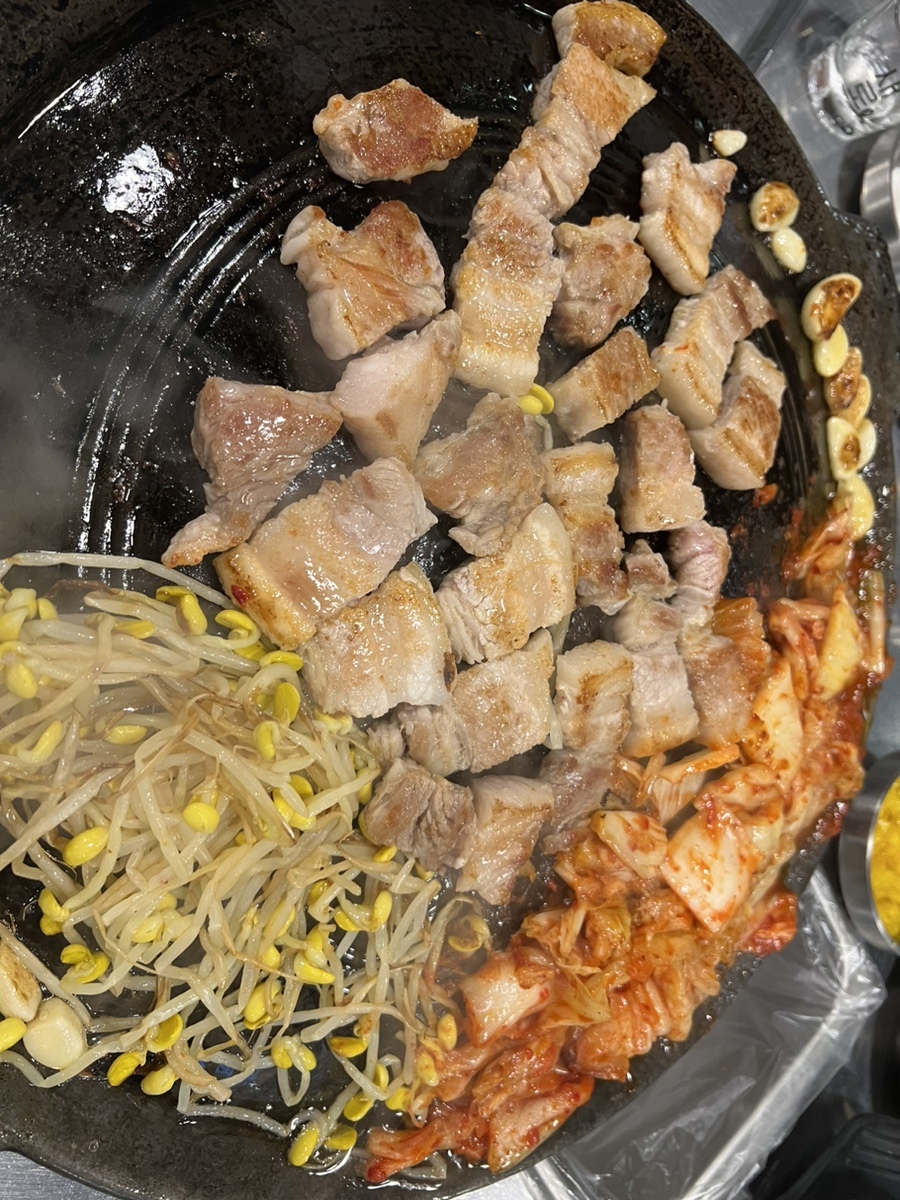 남은 삼겹살한덩어리까지! 삼겹한판인데도 양이많아서 넷이서배터지게 먹었다 진쨔..