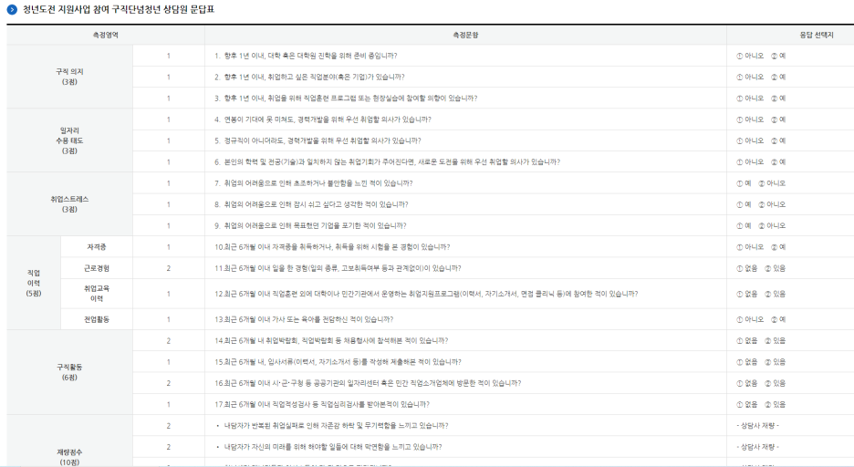 구직의지 일자리 수용태도등 문답후 21점 이상이 나오면 가능해요!