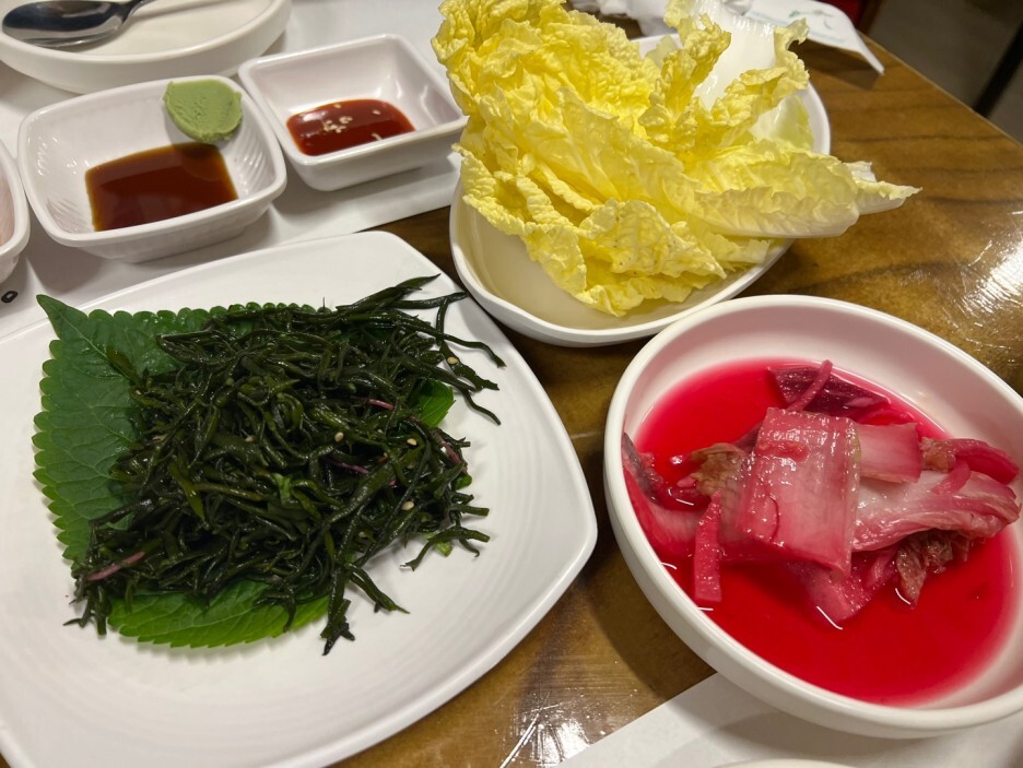 꺳잎 위에 백김치에 해초랑 젓갈 올려서 싸먹으면 정말..하,,또 먹고싶다 너무 맛있어~~~~~~~