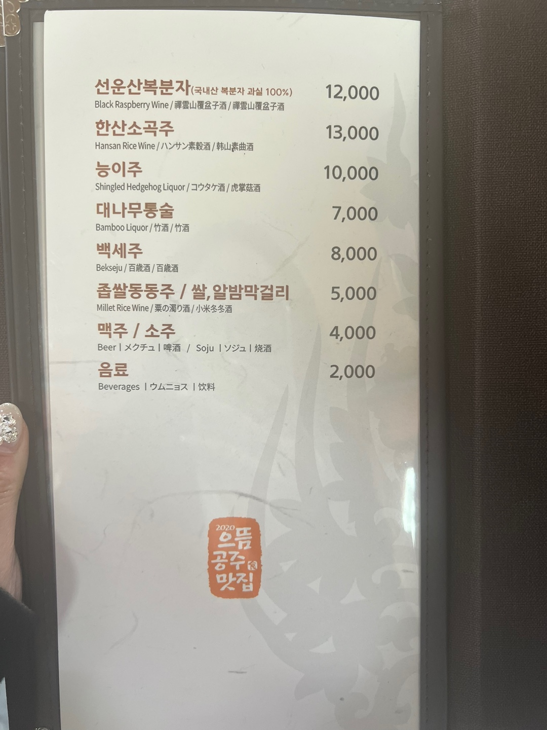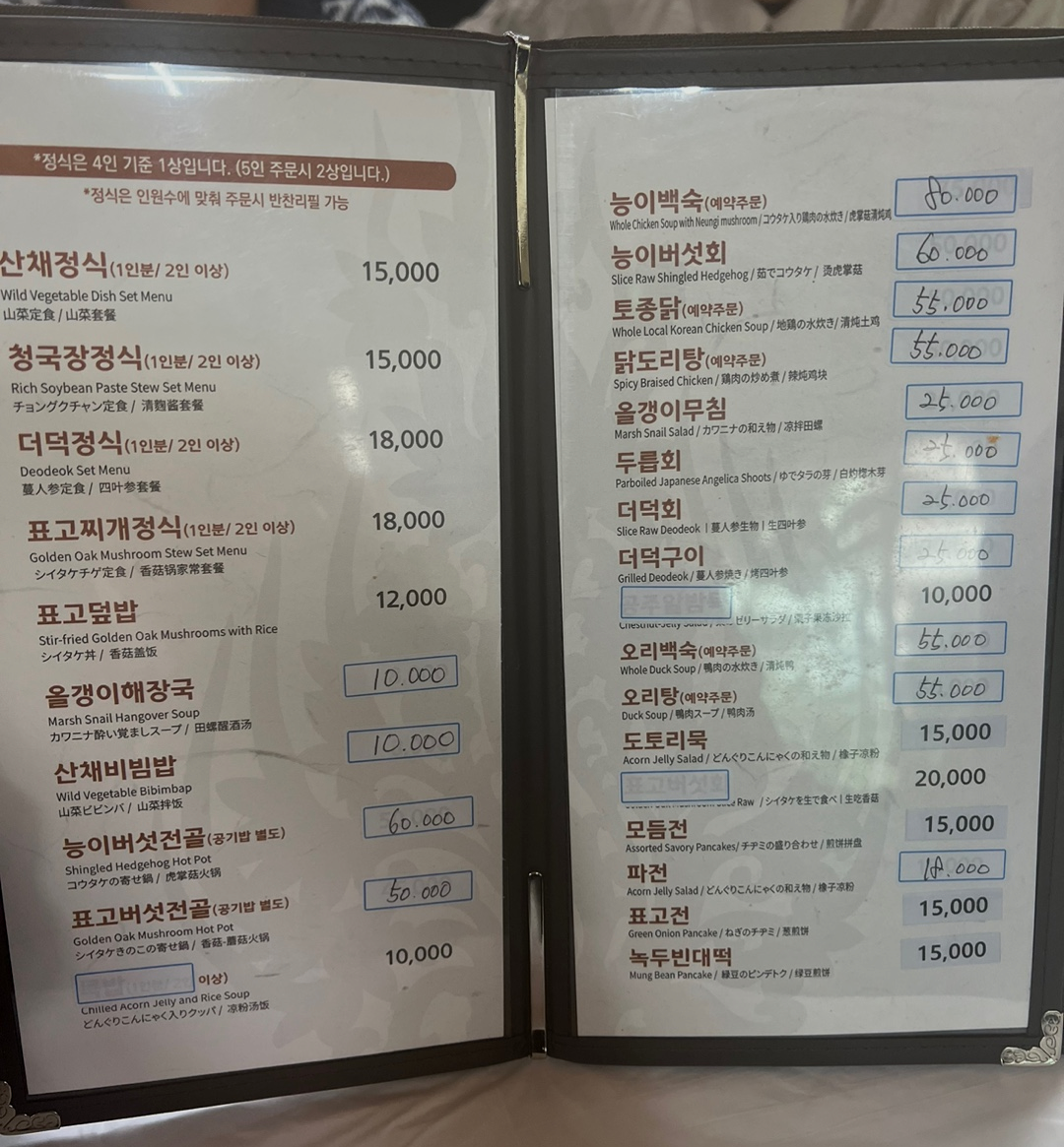 태화식당 메뉴판!! 우리는 더덕정식 2인, 청국장정식 2인을 시켰다!!