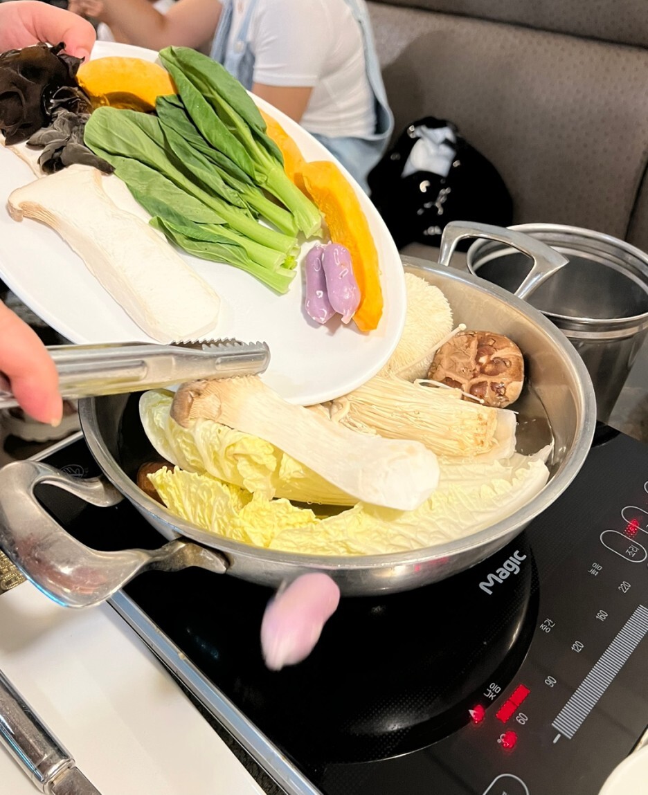육수가 끓기 시작하면 직원분께서 버섯 가득 야채등을 넣어 주신다 보글보글