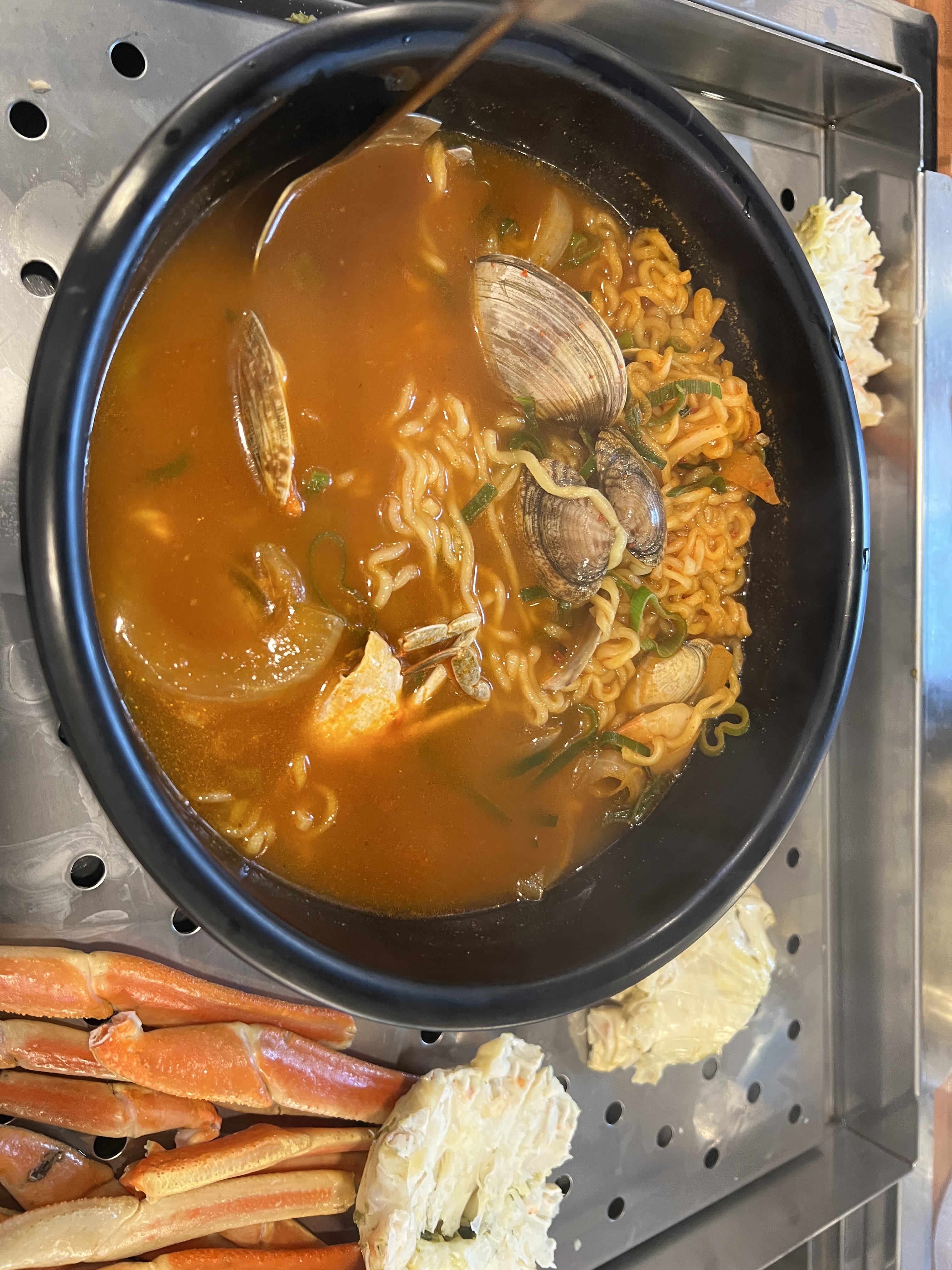 조개 베이스? 국물에 라면사리를 넣어 끓여 먹는 구성으로, 얼큰하고 시원한 맛.