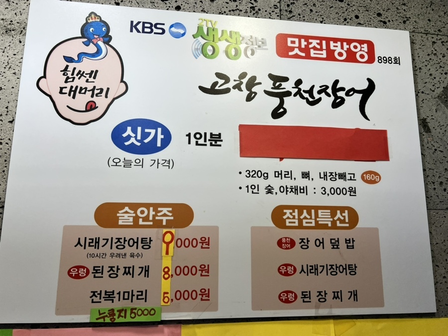 고향 풍천장어 메뉴판 !!! 싯가에따라서 가격이 변동